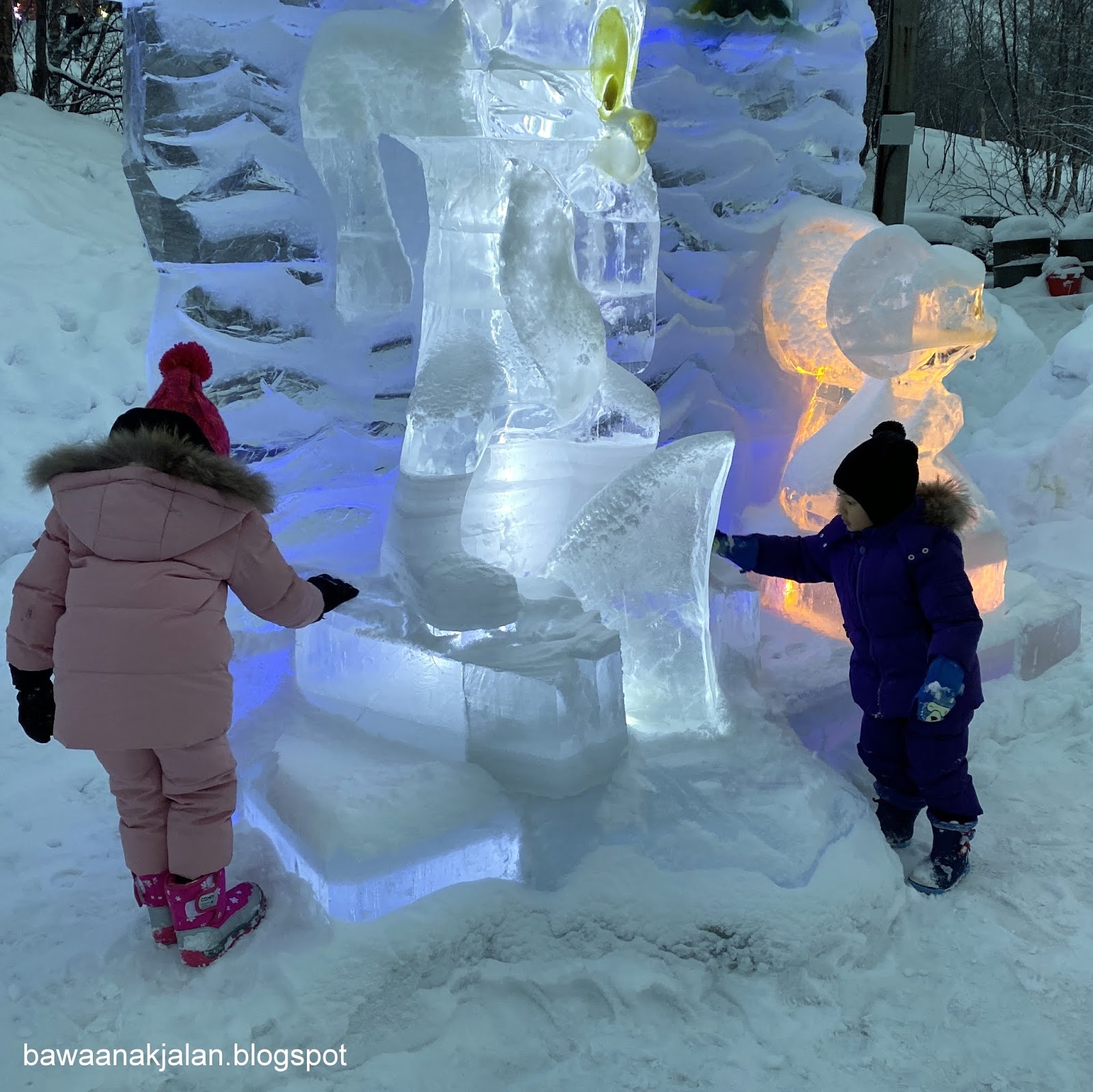Anyway, tempat ni sangat menarik. Especially masa kami kat situ almost takde orang. So Hessa and Muhammad dapat bergolek dan berlari sana sini in the fresh snow. Lepas tu ada pulak ice carving kat tengah2 tu. Cantik... We spent more than half an hour sini until kami puas hati lah.